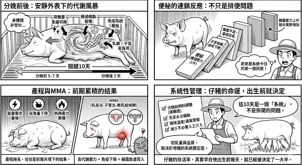 從分娩前 5–7 天到產後 3 天,是母豬一生中代謝與風險最高的窗口期。便秘、產程過長、MMA、初乳不足,都不是獨立事件,而是同一套生理系統被推到極限後的結果。這段時間照顧得好不好,影響的不只是母豬,而是一整窩仔豬的存活與未來表現。