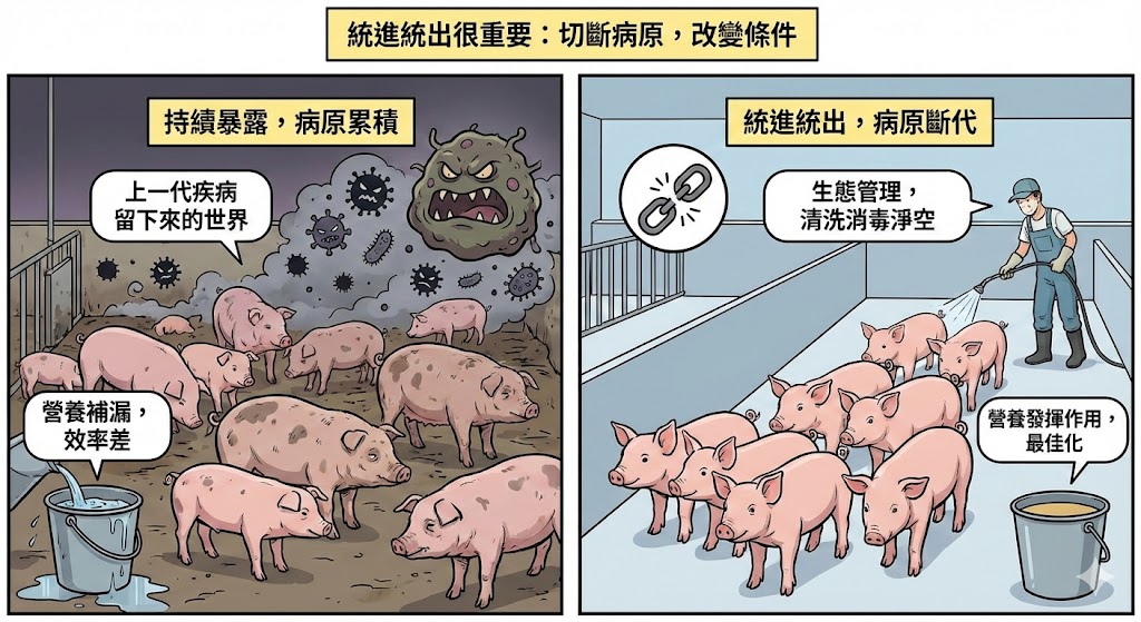 統進統出(All-In/All-Out)常被視為防疫SOP,但它真正的價值,其實是「降低病原壓力,讓營養與生理機制有機會發揮」。當環境長期處在高病原載量下,再精準的配方也救不了生長表現。這篇文章想慢慢談清楚:AIAO為什麼不是形式,而是系統的底層條件。